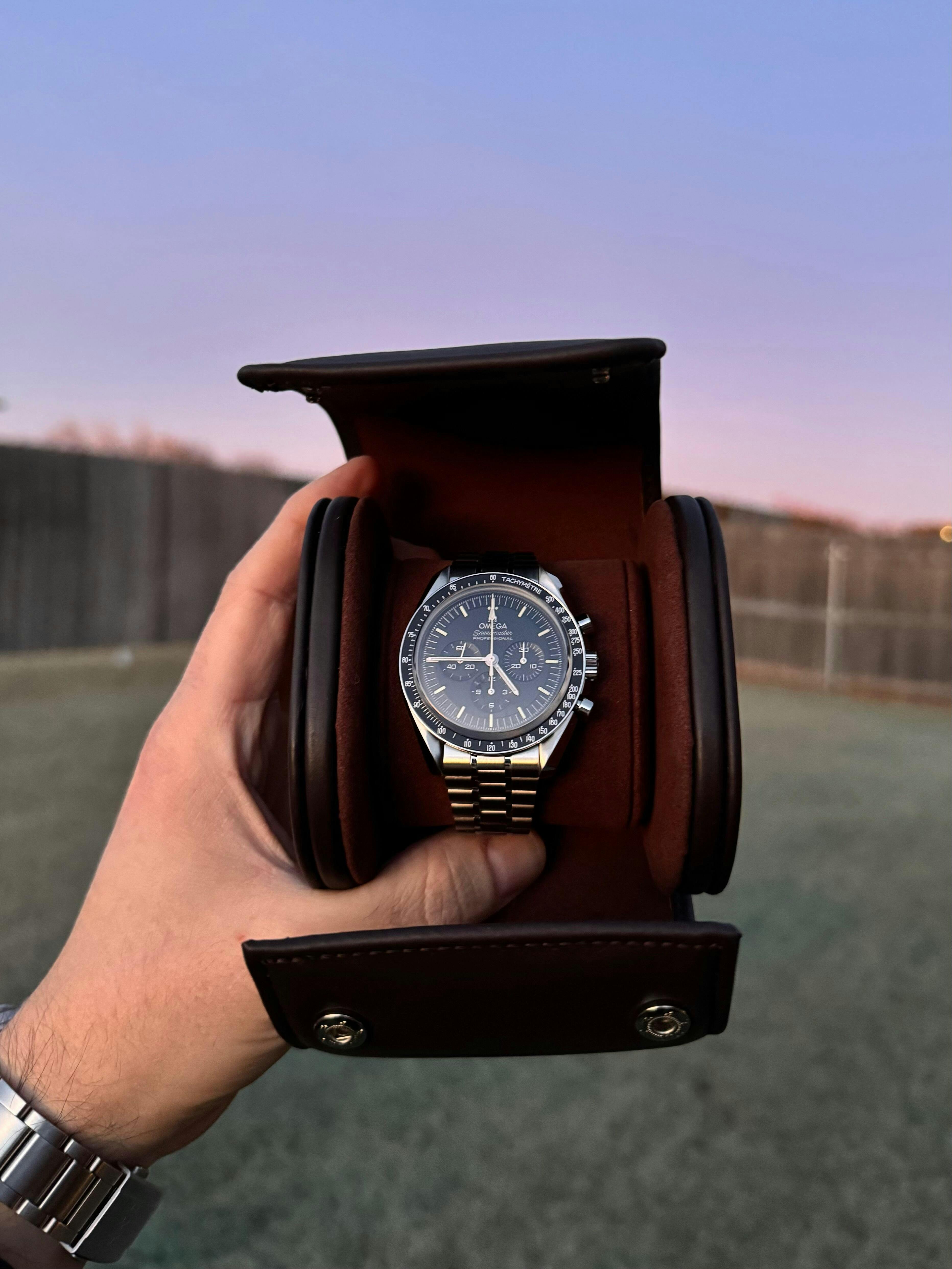 Crafted from genuine cowhide leather in a deep, espresso brown, designed by Jane Goldberg, this pouch is soft in the hand and built to protect. The structured but flexible exterior offers quiet strength, while the interior is lined with moisture-wicking microfiber — a subtle but crucial detail for anyone who stores mechanical watches or metal bracelets.